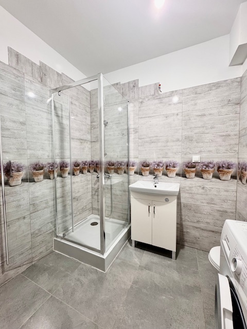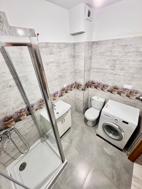 - Łazienka o powierzchni 3,91 m², wyposażona w kabinę prysznicową oraz pralkę, zapewnia komfort użytkowania.