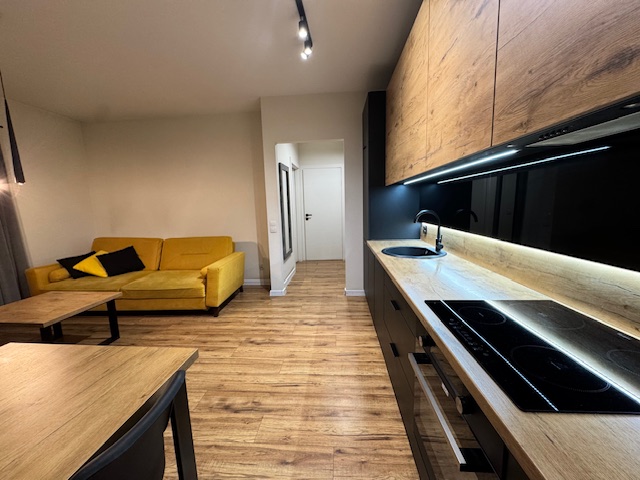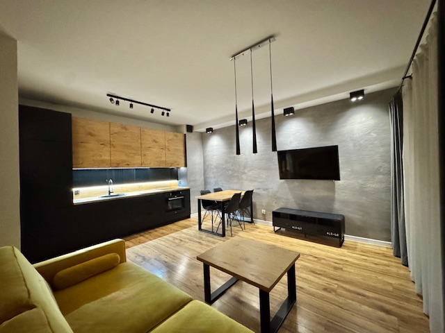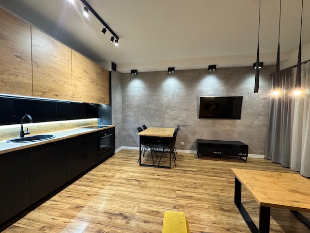 • salon z aneksem kuchennym (aneks kuchenny wykonany z wysokiej jakości materiałów (piekarnik, płyta indukcyjna, zmywarka, lodówka z zamrażarką),