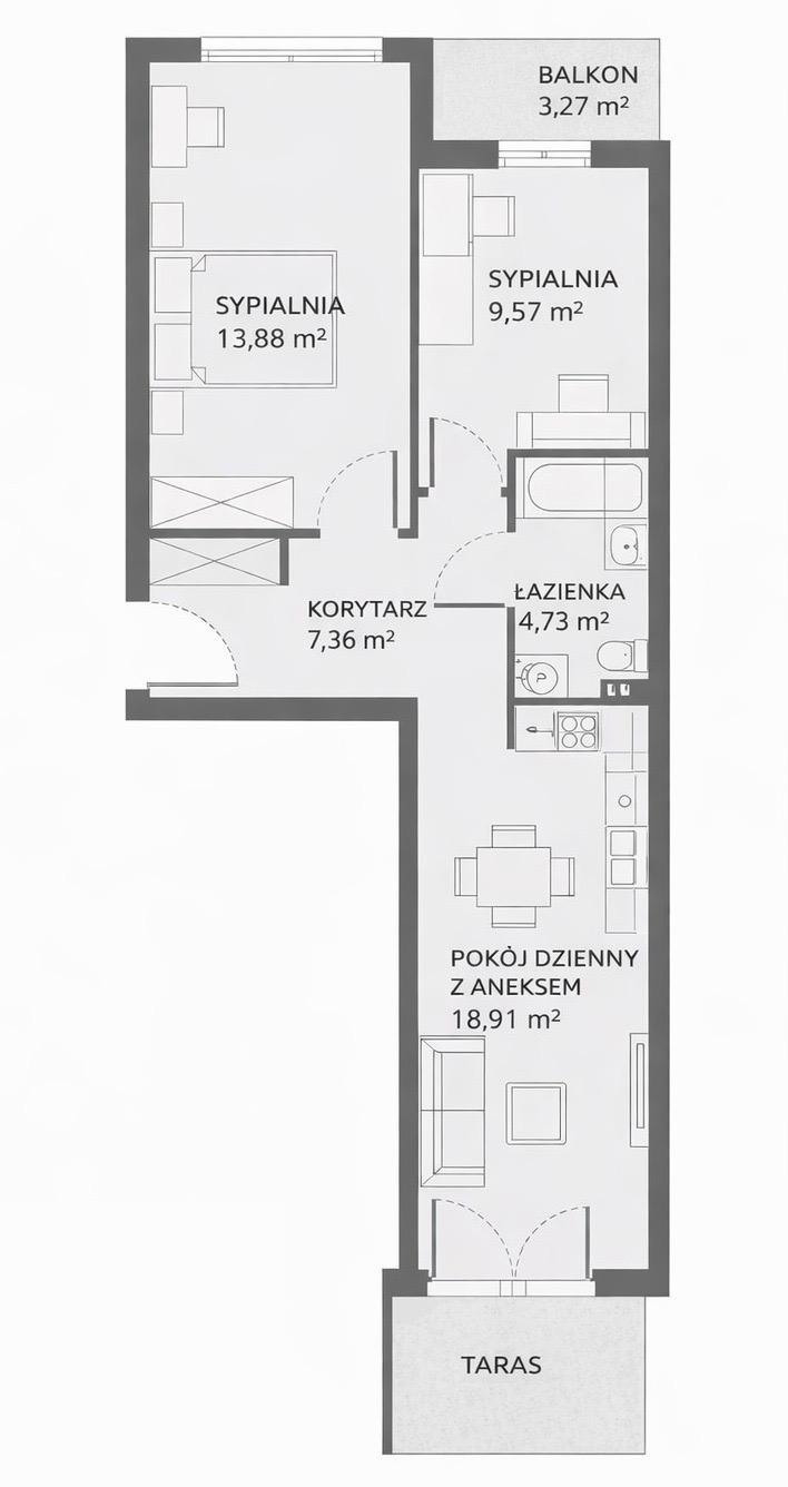 Mieszkanie składa się z przestronnego salonu połączonego z kuchnią, dwóch niezależnych sypialni oraz łazienki z WC.