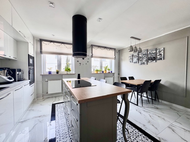 Kuchnia połączona z jadalnią (ok. 18 m²) została zaprojektowana w sposób funkcjonalny i wygodny – oferuje dużo miejsca do przechowywania oraz komfortową przestrzeń do wspólnego spożywania posiłków.