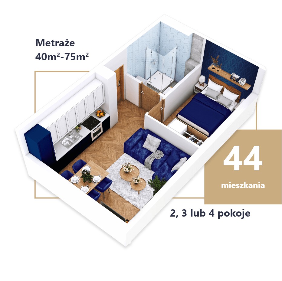 Ten nowoczesny, czterokondygnacyjny budynek został zaprojektowany z myślą o komforcie i funkcjonalności, oferując mieszkania o przemyślanym układzie i doskonałym doświetleniu. W budynku znajdują się 44 lokale, 12 miejsc postojowych w podziemnej hali garażowej oraz 31 boksów rowerowych. Na zewnątrz czeka na Ciebie 17 miejsc postojowych, w tym 5 przystosowanych dla osób